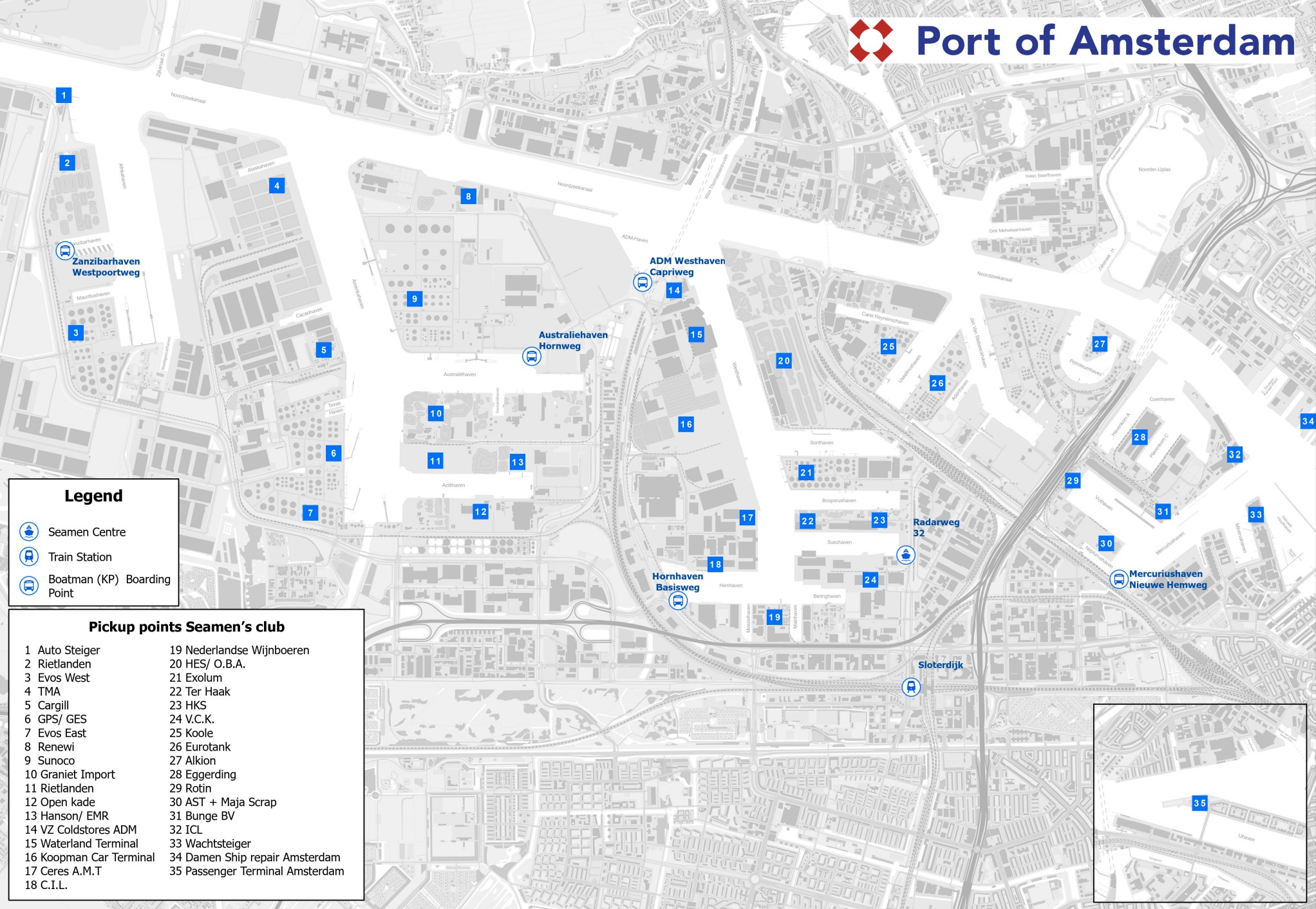 De begeleiding bij toegang tot de wal of het vervoer van en naar het schip verloopt volgens de regels van de terminal. Indien vervoer nodig is, kan dit via de agent worden aangevraagd. Dit kan bijvoorbeeld vervoer over water met de Boatmen (Koperen Ploeg) zijn, of een busje naar het zeemanshuis.